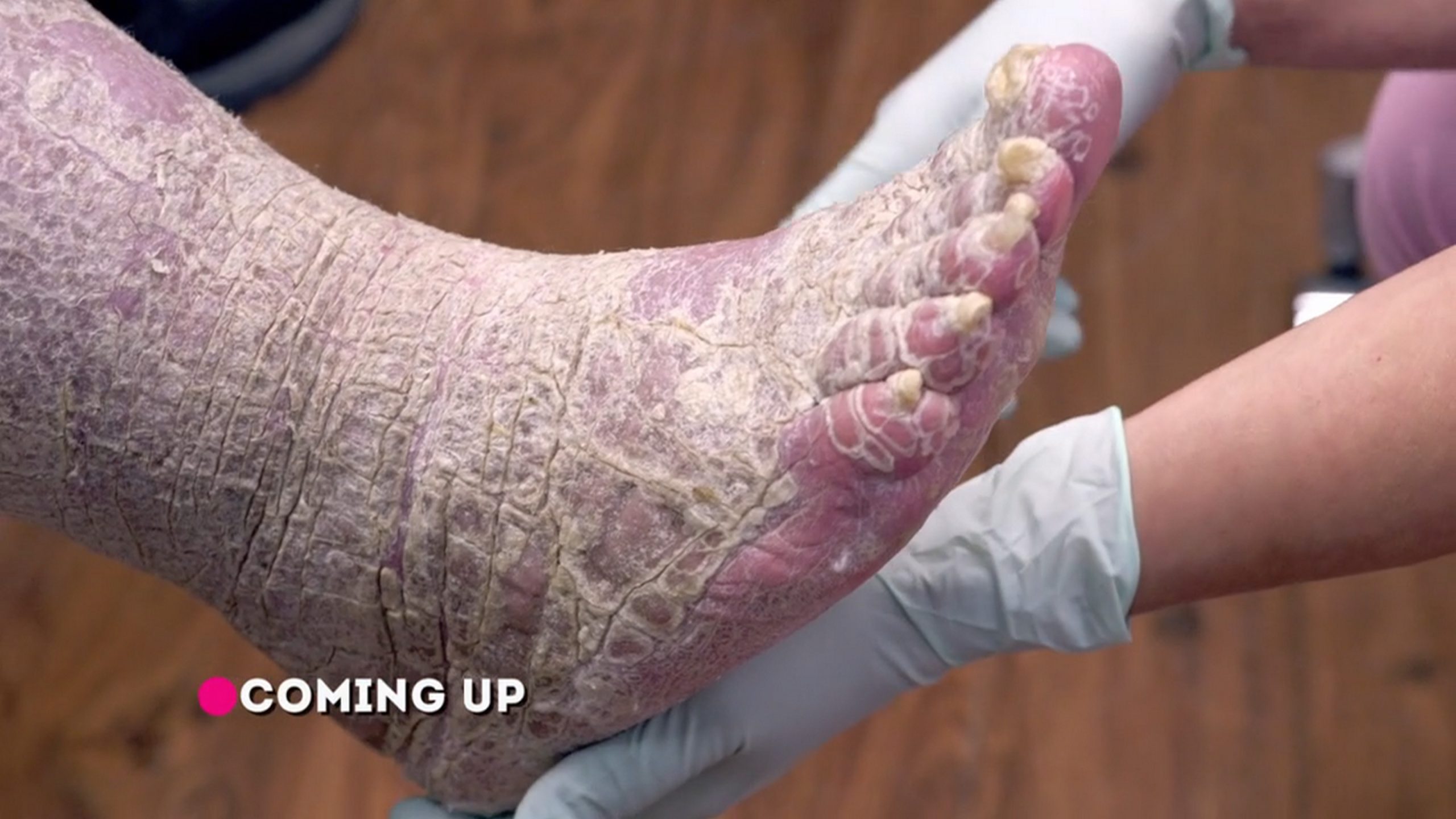 The skin on Yvonne’s hands and feet is so thick, her husband uses dangerous measures to remove it. Discovery TLC SaveMySkin 160426